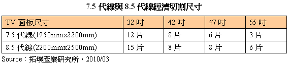 目前電視面板產(chǎn)線以7.5代與8.5代線為主,6代線產(chǎn)能則逐漸轉(zhuǎn)為Monitor面板生產(chǎn)。而7.5代線的經(jīng)濟(jì)切割以42吋、47吋為主,8.5代線以55吋、47吋為主。若55吋需求強(qiáng)勁,7.5代線將不具生產(chǎn)優(yōu)勢(shì),而55吋需求降低,8.5代線又可生產(chǎn)55吋以下產(chǎn)品填補(bǔ)產(chǎn)能,所以8.5代線具有進(jìn)可攻、退可守之優(yōu)勢(shì)。
