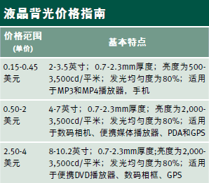 對于中小型應用,廠商的幾乎所有材料都購自珠江三角洲地區和夏門的供應商。由于預計原材料供應與成本將保持穩定,這些背光的價格將保持在0.30-0.40美元。