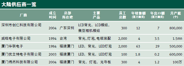 在中國大陸建廠的臺灣、韓國和日本供應商,包括中強光電、Radiant和K-Bridge,加劇了競爭。但這些外資企業目前專注于筆記本、監視器和液晶電視背光,使得小尺寸面板背光領域的競爭更加公平。