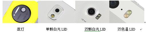 調(diào)查顯示,手機(jī)閃光燈主要有氙燈和LED閃光燈兩類,但氙燈因?yàn)榻Y(jié)構(gòu)復(fù)雜,體積大,難于集成,逐漸被LED閃光燈取而代之。LED憑著自身的光品質(zhì)高、頻閃速度快、低功耗以及體積小、可作連續(xù)光源等諸多優(yōu)點(diǎn)被大多數(shù)智能手機(jī)所采用,如Apple的iphone6、三星GalaxyS5、華為AscendP7、小米4等智能手機(jī)均配置了LED閃光燈,但是采用不同的LED設(shè)計(jì)方案。圖2中給出了市場(chǎng)上幾種典型的手機(jī)閃光燈方案。