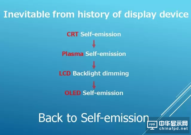 “CRT陰極射線管、等離子都是自發(fā)光,其中CRT陰極射線管具有反應(yīng)非常快、沒有視角的問題、黑暗對(duì)比度比較高、顏色再現(xiàn)性比較好、脈沖響應(yīng)非常靈敏等特點(diǎn),但缺點(diǎn)是只適合模擬視頻;而等離子也具有反應(yīng)速度快、沒有視角問題、黑暗對(duì)比度高等特點(diǎn),缺點(diǎn)是會(huì)留下綠色熒光體殘影,動(dòng)作視頻會(huì)有重影,成本也是非常高,因而沒有得到很好的發(fā)展。”麻倉(cāng)憐士回顧顯示技術(shù)發(fā)展歷程表示:“盡管LCD解決了CRT陰極射線管和等離子技術(shù)存在的缺點(diǎn),但是它自身仍然存在一些無法克服的問題。理想的顯示器是什么呢?它應(yīng)該是結(jié)合了陰極射線管、等離子、LCD液晶所有的優(yōu)點(diǎn),但是同時(shí)又沒有它們的缺點(diǎn)。這是什么呢?這就是OLED。”