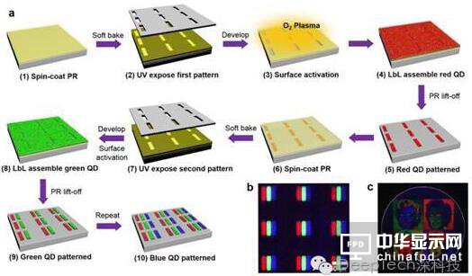 研究者正是將光刻技術與層層組裝技術結合起來,不斷重復進行光刻和組裝過程,實現多色、高分辨率以及大范圍均勻的量子點沉積。