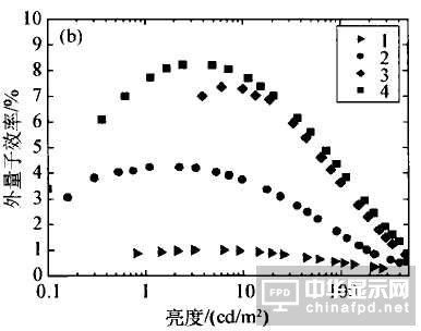 基本上此器件還是呈現出“效率滾降”的現象:當器件的亮度增大到超過10 000cd/m2(或電流密度增大到近120 mA/cm2)時,器件的best減降到7.9%(或3.7 lm/W)。