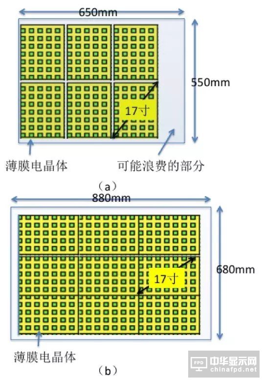 如圖七(a)所示;「四代廠」玻璃基板尺寸為 680×880mm,我們先在玻璃基板上制作薄膜晶體管,再切割成9片17吋的面板。