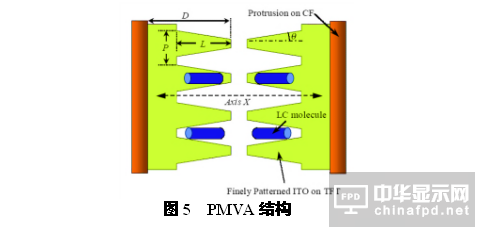 1998年,三星公司提出了PVA的結構,如圖3所示,是在陣列和彩膜基板的像素電極ITO上刻出溝槽。在初始狀態時,液晶分子垂直于基板表面排列,當施加電壓以后,液晶分子沿著電場線的方向進行排列。效果等同于富士通的MVA結構。圖4結構在2008年以前被廣泛專利授權使用,即在彩膜基板上做出凸起,在陣列基板上對ITO像素電極進行刻蝕,這種結構對面板廠來說,設計相對簡單,生產成本低且良率比較有保證。