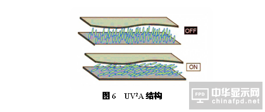 在2006年,日本夏普提出并開發了UV2A的顯示技術,如圖6所示,使用光配向技術,對彩膜和陣列基板兩側的配向膜進行紫外光配向,形成多疇結構。初始狀態時,液晶分子以一定角度排列,當施加電壓以后,液晶分子會按配向的角度進行轉動,從而使光線從液晶面板中透過。