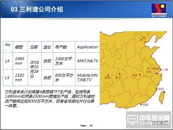據介紹,三利譜光電從2004年就開始研發生產偏光片,是國內領先的偏光片解決方案供應商。目前三利譜光電有四個工廠,第一個是深圳松崗的1330mm中后工序生產線;第二個是福建650mm偏光片產線,產能120萬㎡/年;第三個是深圳光明新區的國內首條1490mm寬幅TFT偏光片全制程生產線,產能600萬㎡/年;第四個是2016年10月28日在合肥新建的工廠,包括兩條線:一條為1490mm,一條為1330mm。目前三利譜光電產品種類豐富,涵蓋應用于手機、家用電器顯示屏、遙控器顯示屏的黑白偏光片、3D偏光片、OLED偏光片。未來三利譜光電還將持續加大偏光片投入,未來計劃建四條寬幅TFT生產線,屆時產能達到8000萬平方米/年,躋身全球第一陣營。
