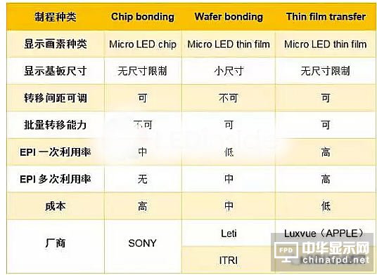 對于半導(dǎo)體與芯片的制程微縮目前已到極限,而在制造上的微縮卻還存在相當(dāng)大的成長空間,對于Micro LED制程上,目前主要呈現(xiàn)分為三大種類:Chip bonding、Wafer bonding和Thin film transfer。