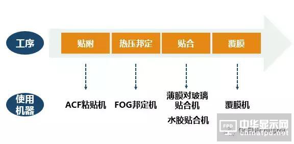 模組組裝工序:是將觸控感應板和玻璃蓋板組裝形成觸摸屏的過程,主要生產(chǎn)工序包括貼附、熱壓、貼合、覆膜等。根據(jù)原材料的不同,貼合工藝可分為薄膜對玻璃貼合、玻璃對玻璃貼合、水膠貼合等類別。