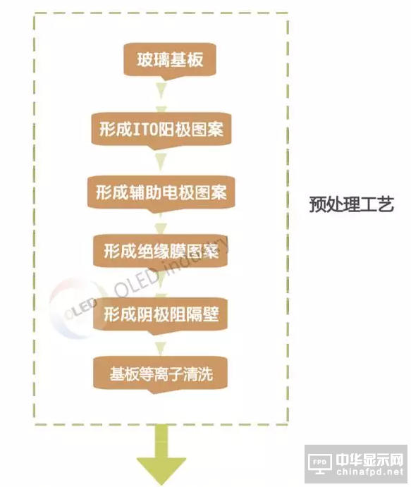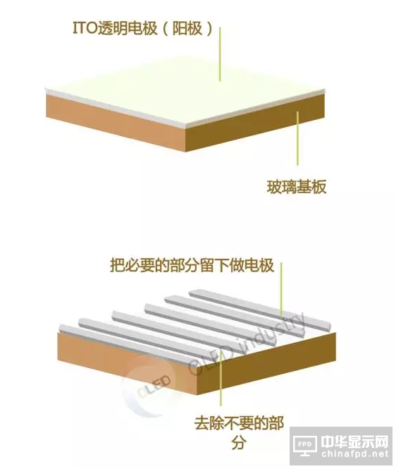 形成ITO電極圖案,為了在圖案化ITO的表面露出發光的部分,需要制備絕緣層,一般采用光刻膠的高分子材料作為絕緣薄膜,最后,由于基板上可能會有殘留的光刻膠或者空氣中的灰塵、水汽因此需要對基板進行清洗處理。