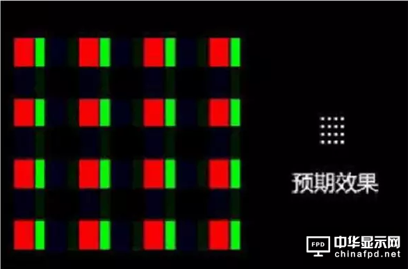 只要顯示的內容不是白色,就會出現兩倍于點距的網格狀斑點。所以說,RGB PenTile技術的顯示屏必須需要擁有足夠高的分辨率,才可以彌補由于會產生兩倍點距紋理帶來的視覺效果下降。