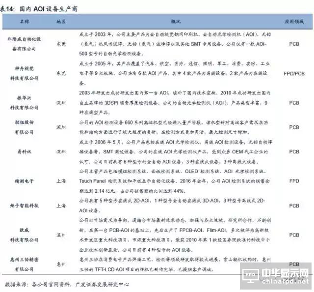 我們測(cè)算得到在AOI設(shè)備的兩大應(yīng)用領(lǐng) 域——PCB和FPD領(lǐng)域在2017年—2020年期間的市場(chǎng)容量合計(jì)353.56億元,年均需 求117.85億元,兩大領(lǐng)域的投資將帶來(lái)百億級(jí)的市場(chǎng)紅利,國(guó)內(nèi)AOI設(shè)備企業(yè)有望迎 來(lái)成長(zhǎng)良機(jī)。當(dāng)前國(guó)產(chǎn)設(shè)備大多數(shù)集中于面板的后段檢測(cè)設(shè)備,AOI產(chǎn)品的競(jìng)爭(zhēng)也主 要集中于后段模組產(chǎn)品領(lǐng)域,而在前段制程環(huán)節(jié),主要由于海外企業(yè)把控高端應(yīng)用市場(chǎng)。