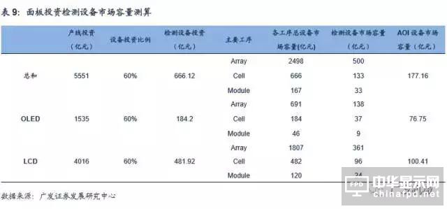 由于LCD和OLED在工藝流程上存在較大差異,對(duì)檢測(cè)設(shè)備的要求也不同,我們根據(jù) 兩種類型的面板未來(lái)投資情況分開(kāi)測(cè)算2017—2019年LCD-AOI和OLED-AOI的市 場(chǎng)容量情況。