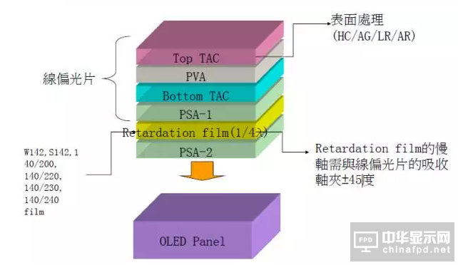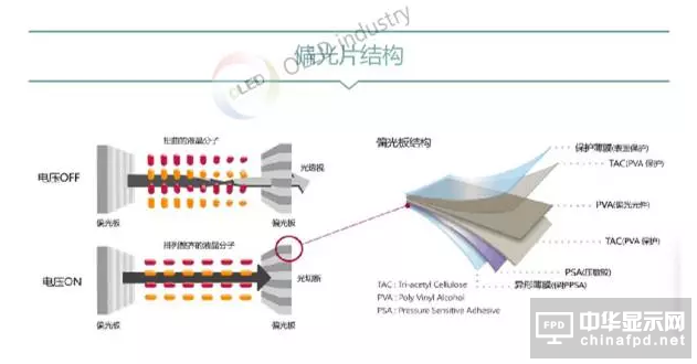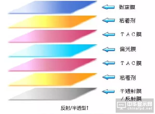 由偏光膜(PVA)、保護膜(TAC)、壓敏膠層、離型膜、保護膜、光學補償膜等符合而成,基本結構是兩層TAC膜夾一層拉伸后的PVA膜。