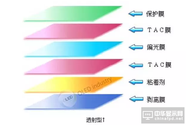 偏光片主要由PVA膜、TAC膜、保護膜、離型膜和壓敏膠等符合制成,其功能是將背光中透出的光向單一方向通過,并將另一方向的光切斷。