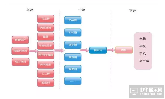 偏光片上游是光學材料供應商,下游是液晶顯示模組廠商及各類終端產品生產廠商。