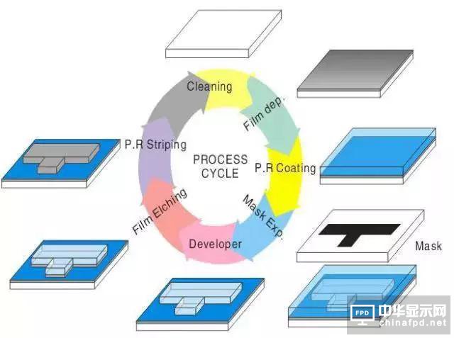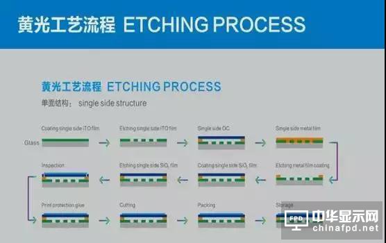 將涂有光刻膠的鍍膜玻璃進行曝光、顯影處理,然后通過溶液實現腐蝕處理掉所需除去的部分(ITO或金屬)、用離子反應或其它機械方式來剝離、去除光刻膠材料的一種過程。