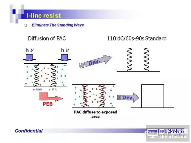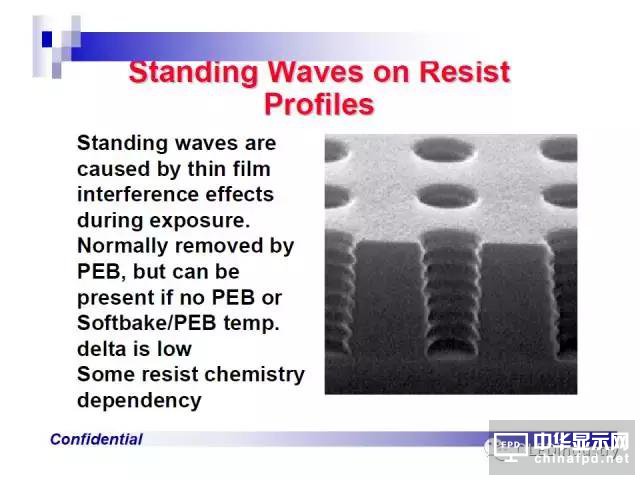 在曝光時由于駐波效應的存在,光刻膠側壁會有不平整的現(xiàn)象,曝光后進行烘烤,可使感光與未感光邊界處的高分子化合物重新分布,最后達到平衡,基本可以消除駐波效應。