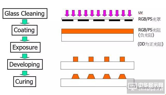 負光阻制程 :光阻沒照到紫外光的部份會在后續顯影步驟中被移除。如 : R, G, B, PS.