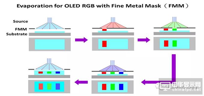 由于目前AMOLED面板量產(chǎn)的主流方法是真空蒸鍍,而真空蒸鍍必須用到FMM蒸鍍技術(shù),在干式制程中運用遮罩將RGB 三種光色分子分別附著于狹小的區(qū)域中。應(yīng)用于大尺寸面板時,大尺寸Mask在蒸鍍制程中易產(chǎn)生變形與材料過度使用等弊病,維持平坦的表面是制程相對較難的精密金屬遮罩的關(guān)鍵技術(shù)。