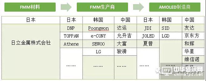 但是從現(xiàn)階段的FMM形成的產(chǎn)業(yè)鏈來看,上游材料INVAR(10~20 μm 厚)只有日立金屬可以生產(chǎn),而中游主要是日韓和中國臺灣地區(qū),實際上中國大陸能夠量產(chǎn)FMM的并沒有(下表中的大陸企業(yè)都是CMM,并不是FMM),但是中國大陸卻是需求量最大的市場。
