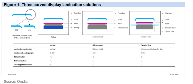 圖1列舉了三種不同的曲面玻璃貼合方案。