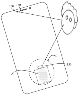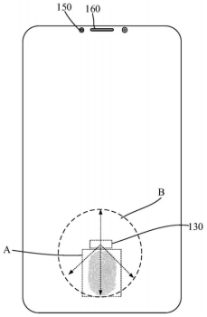 如上圖所示為該專利提供的手機結(jié)構(gòu)示意圖,其中主要包括顯示面板110(如下圖所示)、光學(xué)指紋模組120(如下圖所示)、結(jié)構(gòu)光發(fā)射組件130,結(jié)構(gòu)光發(fā)射組件的發(fā)射光在顯示面板上的照射區(qū)域覆蓋光學(xué)指紋模組的指紋識別區(qū)域。