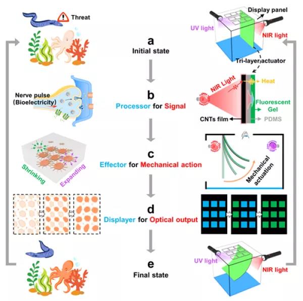 圖1.頭足類動物變色機(jī)理(左)和“光-機(jī)械運(yùn)動”調(diào)制熒光系統(tǒng)設(shè)計(jì)示意圖(右)