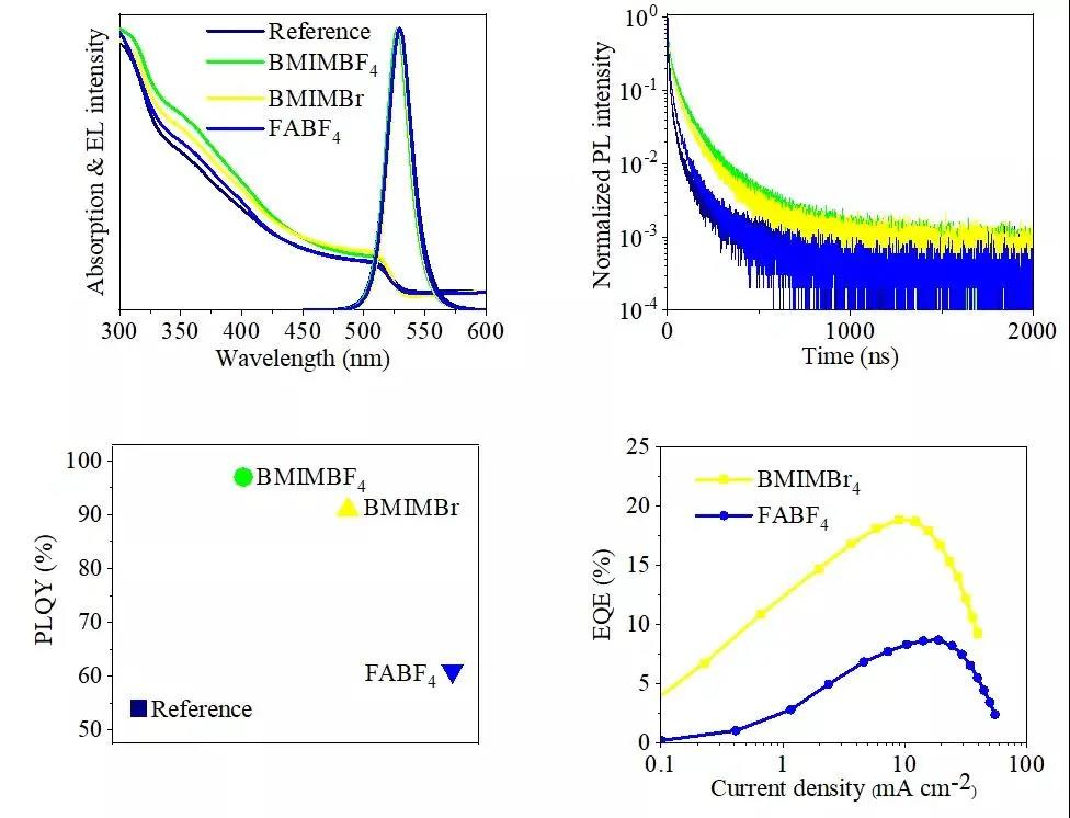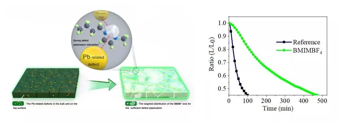通過比較分析含有不同陰陽對離子的離子液體(BMIMBF4,BMIMBr和FABF4)修復鈣鈦礦薄膜的光物理特性和器件性能,發現缺陷鈍化主要來源于BMIM+ 離子,而BF4-離子的鈍化效果不明顯。BMIMBF4修復的鈣鈦礦多晶薄膜的光致發光量子產率接近100%,表明薄膜中的缺陷點位得到了充分鈍化。