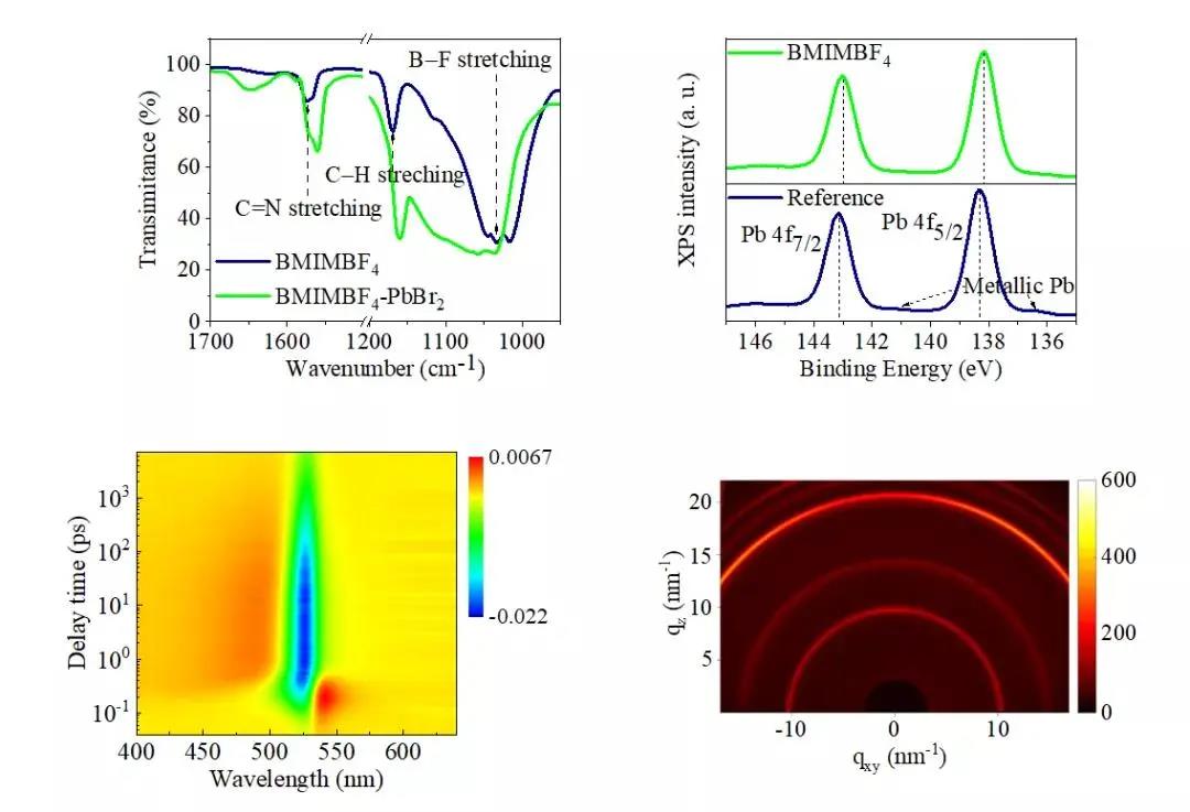 FTIR和XPS測試結果表明,BMIM+離子的鈍化主要為咪唑環上C=N官能團對鉛相關的離子或原子缺陷的路易斯酸堿相互作用;同時,氫鍵相互作用加強了缺陷鈍化效果。TAS測試結果進一步證實鈣鈦礦薄膜中的非輻射復合得到了有效抑制;并通過GIWAXS測試分析推測,BMIM+ 和BF4-離子沒有進入鈣鈦礦晶格而靶向地分布于薄膜的晶界和表面, 有利于缺陷點位的充分鈍化。