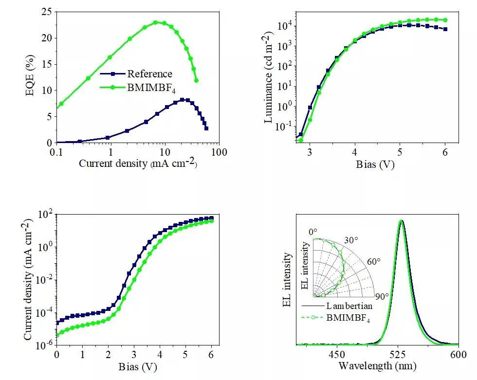 近日,電子科技大學光電科學與工程學院李世彬教授課題組在ACS Energy Letters (美國化學學會-能源快報)上發表了題為“Targeted Distribution of Passivator for Polycrystalline Perovskite Light-Emitting Diodes with High Efficiency”的高效率鈣鈦礦LED最新研究成果。光電科學與工程學院2018級博士研究生彭雪峰和西南大學物理科學與技術學院楊曉暉為共同第一作者,光電科學與工程學院李世彬和陳力教授為共同通訊作者,電子科技大學光電科學與工程學院為第一作者單位。該工作采用離子液體(BMIMBF4)修復多晶鈣鈦礦薄膜,通過路易斯酸堿的鈍化作用和BMIM+ 離子鈍化劑的靶向分布,實現了充分缺陷鈍化進而大幅提高器件的發光效率和工作穩定性?;诒狙芯拷M已報道的能夠高效鈍化多晶鈣鈦礦薄膜下表面的聚苯乙烯磺酸鈉改性PEDOT:PSS空穴傳輸層,制備了離子液體(BMIMBF4)靶向分布引起對PEA(FAPbBr3)4Br鈣鈦礦薄膜充分缺陷鈍化的高效率發光二極管,其外量子效率為22.9%,電流效率為98cd A-1 ,發光波長為529nm。
