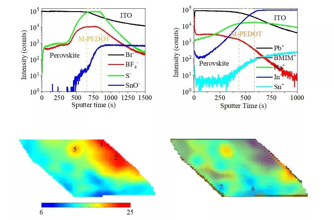 進一步采用SIMS測試分析發現,BF4-離子主要分布于空穴傳輸層及其與鈣鈦礦層的界面,進一步證實了缺陷鈍化不是來源于BF4-離子;然而,BMIM+離子靶向地分布于鈣鈦礦薄膜內部和上表面并與缺陷點位的分布有很好的匹配,進而促進了鈣鈦礦薄膜中缺陷點位的完全鈍化。鈣鈦礦發光層的Nano-IR Mapping同時直觀地顯示出了BMIM+離子的上表面聚集和缺陷鈍化相互作用,分析發現BMIM+ 離子的聚集并沒有完全覆蓋薄膜表面且其隨機的分布與薄膜形貌無關;然而,BMIM+離子缺陷鈍化相互作用的信號基本完全覆蓋整個薄膜,直觀地表明并證實了BMIM+離子鈍化劑的靶向分布能夠充分鈍化形成于多晶鈣鈦礦薄膜晶界和表面的缺陷點位。