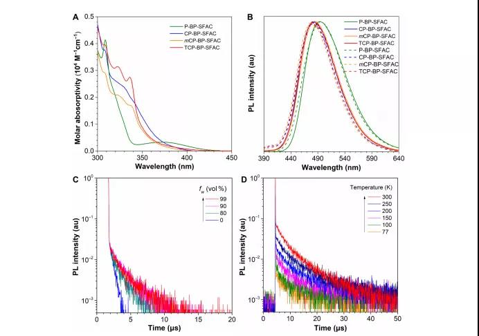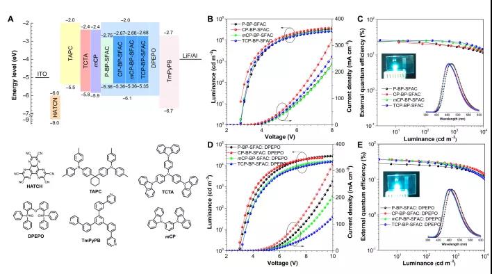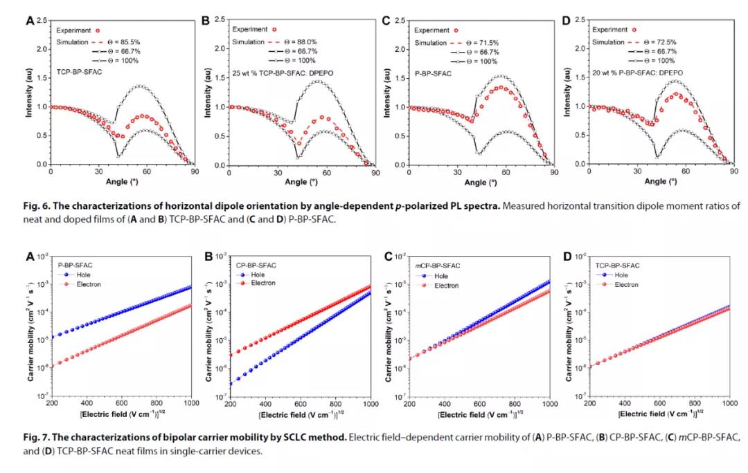 這些分子具有很強(qiáng)的天藍(lán)色延遲熒光,并表現(xiàn)出優(yōu)異的光致發(fā)光量子產(chǎn)率、大的水平偶極取向比率和平衡的雙極載流子傳輸?shù)韧怀鰞?yōu)點(diǎn)。