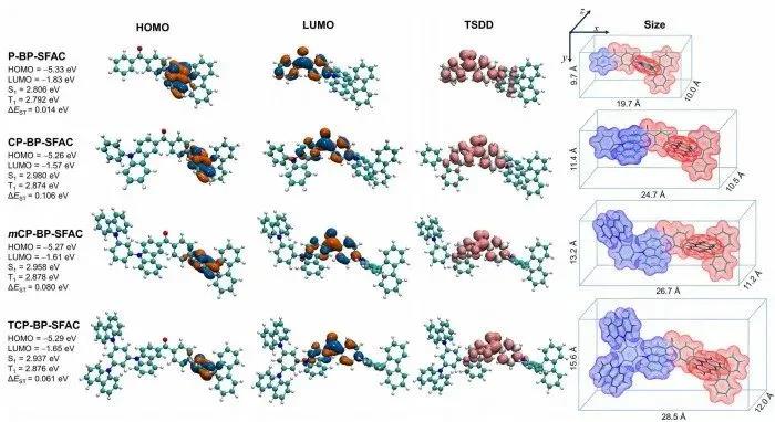 此外,利用理論計(jì)算方法,該研究揭示了所構(gòu)建分子實(shí)現(xiàn)高性能 OLED 的機(jī)理。