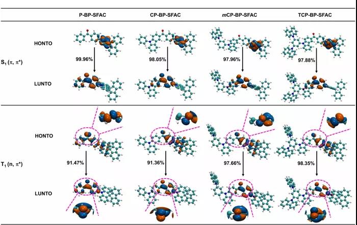 在這些分子中,羰基和螺吖啶通過(guò)苯基橋形成一個(gè)扭曲的 D-A 分子骨架,主導(dǎo)天藍(lán)色延遲熒光的產(chǎn)生。由于 n-π* 躍遷的存在,羰基核有利于增強(qiáng)自旋軌道耦合效應(yīng)(SOC,spin-orbit coupling)和反向系間竄越(RISC, reverse intersystem crossing)過(guò)程,從而促進(jìn)延遲熒光的產(chǎn)生,提高激子利用率。