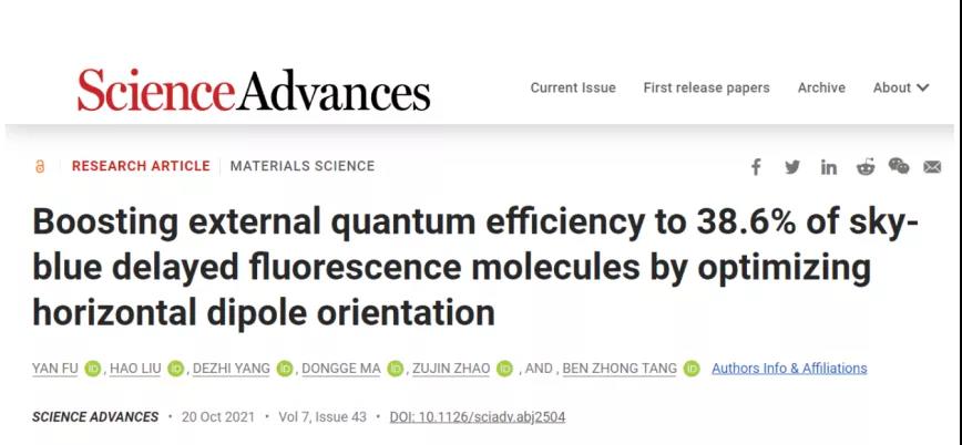 10 月 20 日,相關(guān)論文以《優(yōu)化水平偶極取向以提高天藍(lán)色延遲熒光分子的外量子效率至38.6%》(Boosting external quantum efficiency to 38.6% of sky-blue delayed fluorescence molecules by optimizing horizontal dipole orientation)為題,發(fā)表在 Science Advances 上[1]。