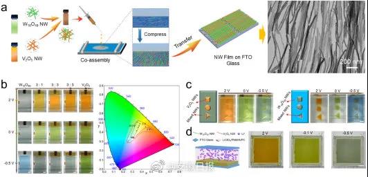 俞書宏院士團隊研制出一種基于納米線組裝體的多色顯示電致變色器件,通過采用界面組裝技術將氧化鎢和氧化釩納米線組裝在一起,從而使器件具有特定的光學、電學和多色顯示特性。在施加不同電壓下,組裝體可以呈現(xiàn)出由橙色、綠色到灰色的動態(tài)顏色變化。通過控制兩種納米線的比例,還可調(diào)控組裝薄膜的顏色顯示、透明度、響應時間、著色率等電致變色性能。此外,在掩膜板輔助下,界面組裝技術通過構造各種圖案和調(diào)控組分,可以實現(xiàn)更復雜的色彩顯示和信息傳輸。