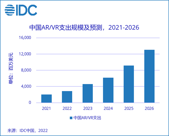 IT之家了解到,IDC 預測,2021年中國AR / VR市場IT相關支出規模約為21.3億美元,并將在2026年增至130.8億美元,為全球第二大單一國家市場。