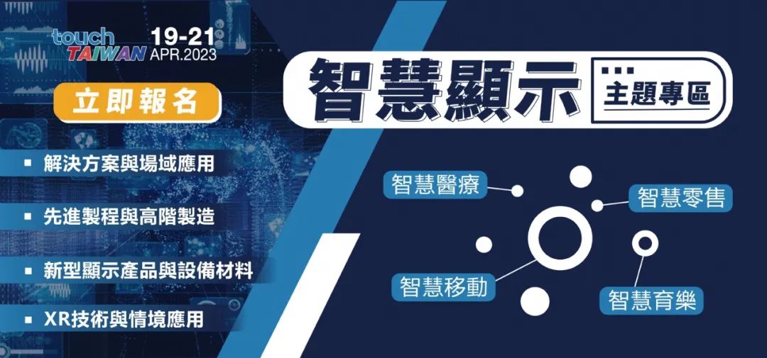 Touch Taiwan智慧顯示展是中國臺灣地區上半年度最大的電子科技產業盛會。2023 Touch Taiwan 將以“Connection跨域共創,連接未來”為主題,鏈結ICT產業、品牌廠商、生產制造廠商,共同展現技術成果及解決方案,與跨域伙伴們一起打造合作生態系,展會將提供涵蓋多元創新技術、應用、解決方案及交互式體驗服務,協助廠商挖掘新商機。