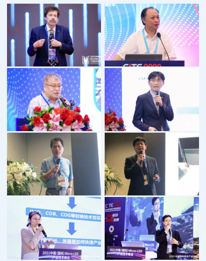 歷屆峰會邀請到了來自中國、美國、日本、韓國、歐洲等國家和地區的Mini/Micro-LED領域的院士專家、代表企業、院校及研究機構、分析機構等分享產業熱點、難點。eLux、錼創、AIXTRON SE、TOPCON、京東方、海信、TCL華星、天馬、華燦光電、三安光電、辰顯光電、新益昌、柔浩電子、諾瓦星云、康佳、Hexagem AB、科韻激光、創維-RGB、江西沃格光電、華引芯、隆利科技、艾比森、中麒光電、志金電子、兆馳光元、TCL工業研究院、雷曼光電、瑞豐光電、撲浪創新、InZiv、NS Nanotech、ATTOLIGHT、國星光電、阿爾泰、思坦科技、勁鑫科技等知名企業;北京大學、南方科技大學、臺灣交通大學、華南理工大學、廣東省半導體產業技術研究院、深圳第三代半導體研究院、University of Michigan、廈門大學、福州大學、南昌大學等專業院校和研究機構;IHS Markit Global Korea、Yole Developpement等業內分析機構均帶來了產業鏈技術、材料、設備、終端應用等各環節的干貨分享。