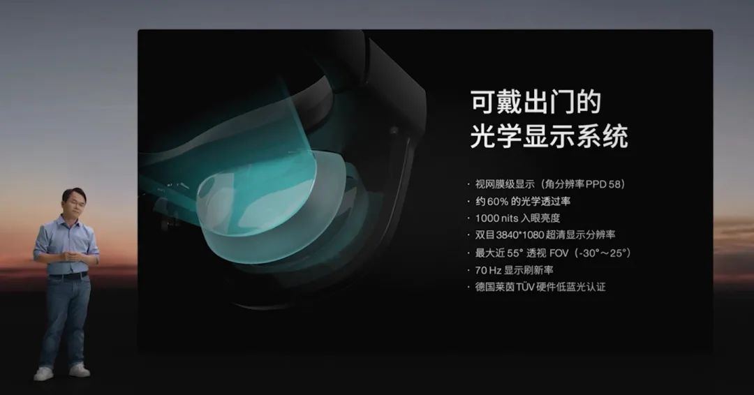 屏幕部分,ARknovv A1標配電致變色鏡片,采用了Micro OLED屏幕與自由曲面導光棱鏡組成的光學模組,分辨率為雙目3840×1080,有55°的透視FOV(-30°~25°)和70Hz的顯示刷新率,角分辨率(PPD)為58,官方宣稱該光學模組的光線透過率高達60%,實現入眼亮度1000尼特。ARknovv A1還支持使用帶有屈光度的鏡片,官方將提供全套的配鏡服務。