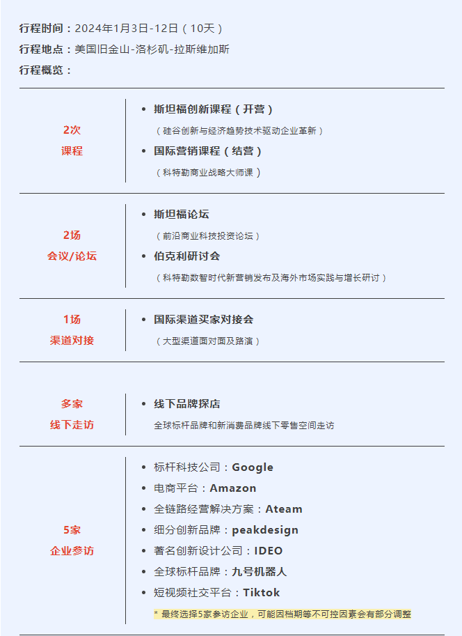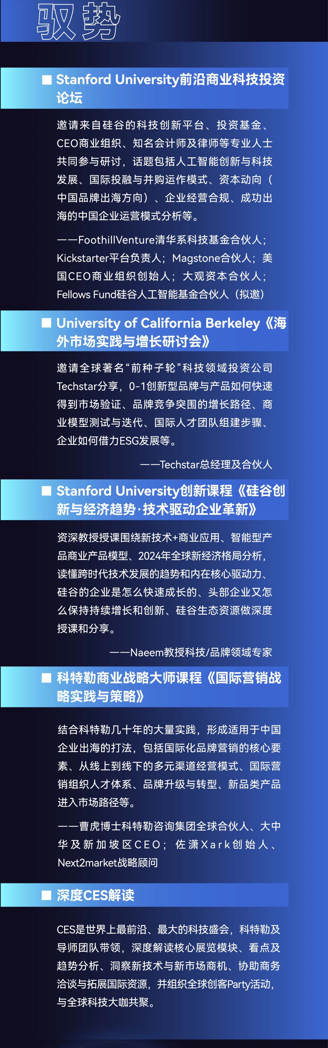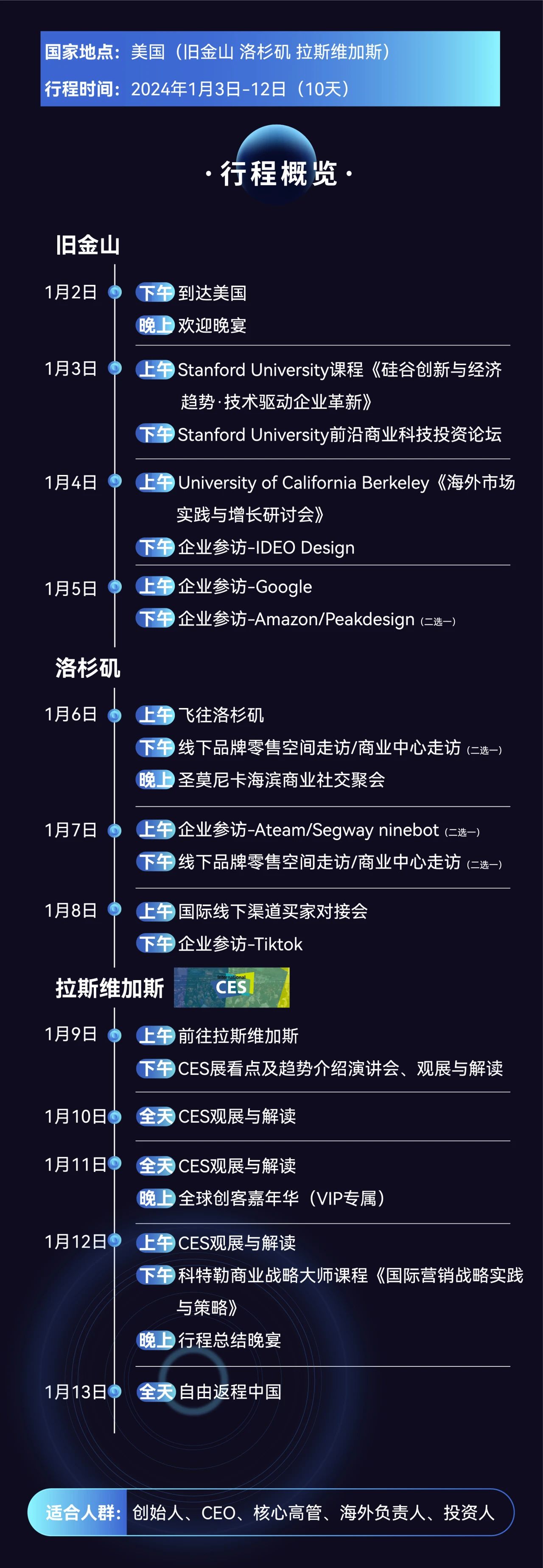 2024年1月,深圳市平板顯示行業協會(SDIA)將與科特勒&Xark導師團,帶領中國標桿企業、細分領域冠軍企業、創新型企業出行美國,與全球領先企業面對面研討,開展大型渠道合作洽談與投資平臺鏈接、頂級教授交流等,同時參加“2024年CES美國國際消費類電子產品展覽”研學營,聆聽專家解讀智能科技消費電子和品牌塑造新機遇!