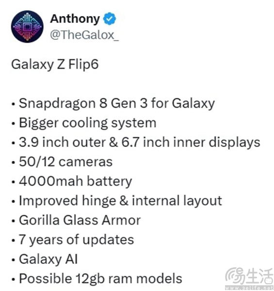 根據此次曝光的配置信息顯示,Galaxy Z Flip6或將沿用6.7英寸的內屏,外屏則可能會由現款的3.4英寸繼續擴大至3.9英寸,有望搭載高通驍龍8 Gen3 for Galaxy主控,以及12GB內存,并提供4000mAh電池。影像方面其所配備的可能是由5000萬像素主攝+1200萬像素副攝組成的后置雙攝模組,此外還將繼續提供Galaxy AI相關功能,以及長達7年的系統更新。