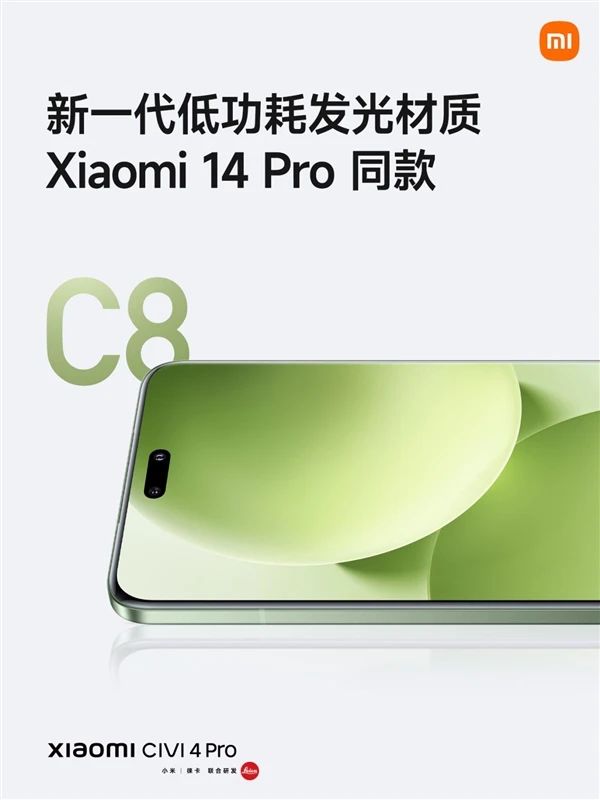 小米官方宣布小米Civi 4 Pro搭載了小米14 Pro同款的新一代C8發光材料,峰值亮度達到了3000尼特。
