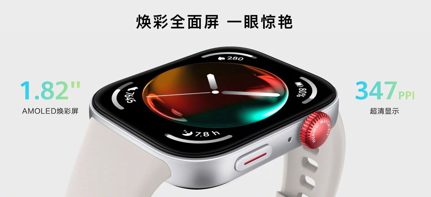 該手表選用了一塊 1.82 英寸圓角矩形 AMOLED 屏幕,最高亮度 1500 尼特,PPI 達 347,擁有 60Hz 刷新率,屏占比 77.4%。