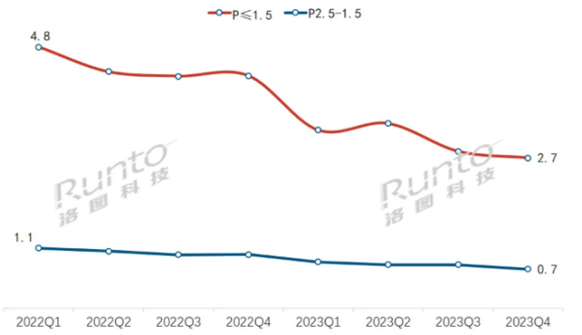 微縮化趨勢不改,但進程有所放緩。LED小間距終端市場分間距來看,根據(jù)迪顯咨詢數(shù)據(jù),2023年全年P(guān)1.2mm為主的間距段銷額出貨位居首位,P1.0mm以下的微間距產(chǎn)品銷額占比破10%,但是兩項產(chǎn)品同比2022年度僅有微幅成長。P1.5-2.5仍然占據(jù)60%以上的出貨份額,仍是渠道市場的出貨主力產(chǎn)品。