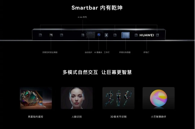 華為智慧屏 V5 Max 110 頭頂 SmartBar 結構,主要包含一顆 AI 攝像頭,支持靈犀指向遙控,支持投屏反控,可在家實現暢玩游戲,暢快辦公等“巨幕手機”百種玩法。