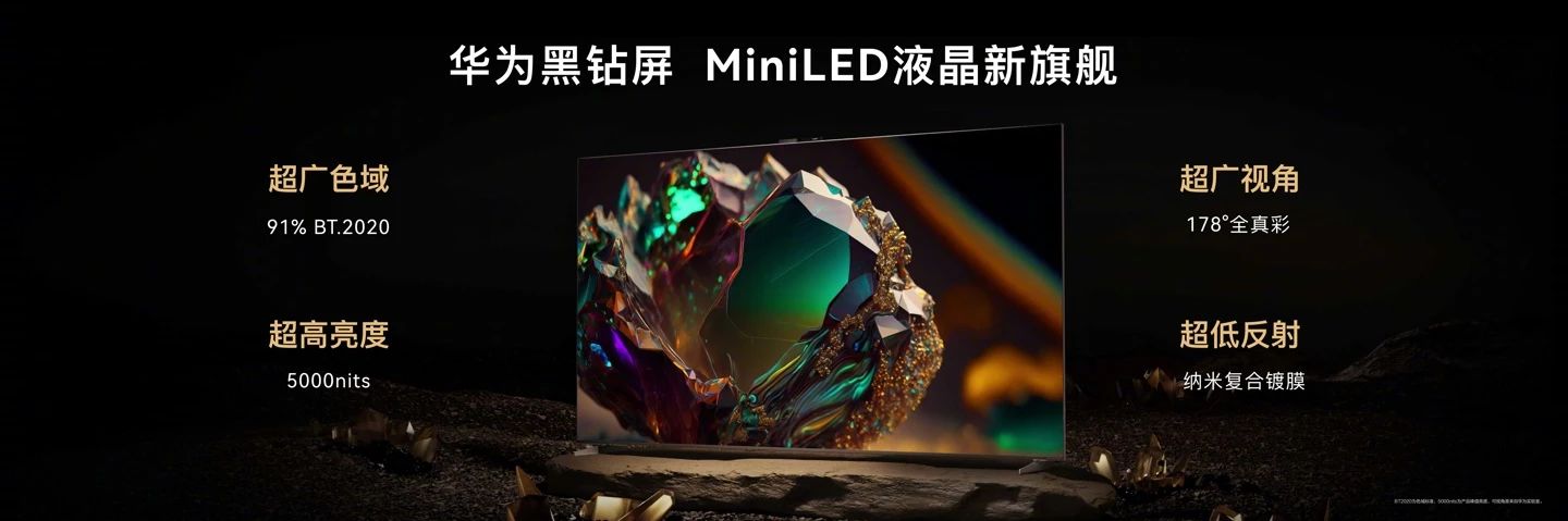 新品配備全新一代 Super Mini LED 黑鉆屏,1.2mm 超窄航空鋁邊框,屏占比達到 99%,擁有 5000nits 峰值亮度和 5040 分區(qū),覆蓋 91% BT2020 色域,8,000,000:1 高對比度、178 度超廣可視角。支持靈犀指向遙控、HUAWEI SOUND 空間音頻,預裝鴻蒙 HarmonyOS 系統(tǒng)。
