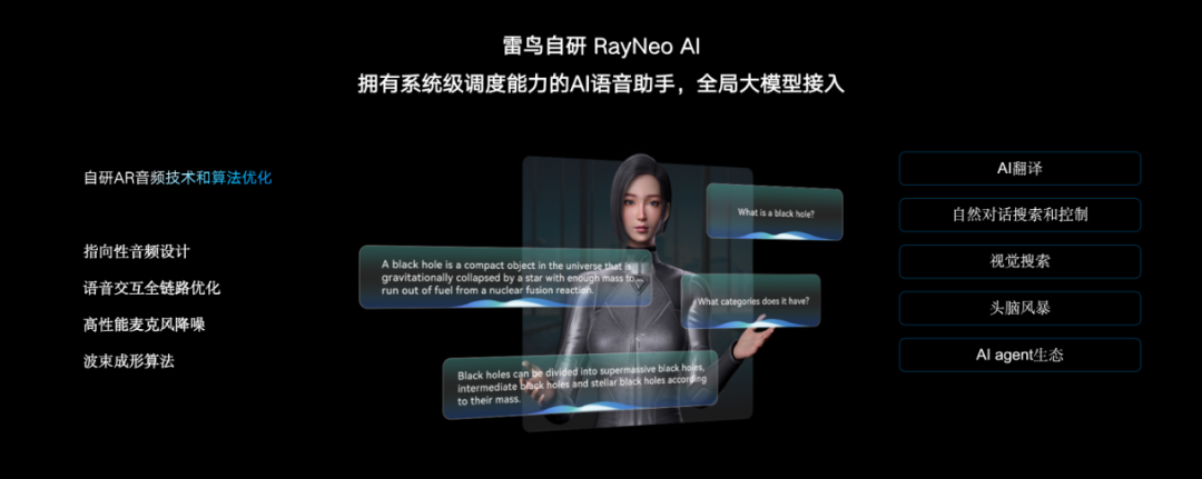 AI 大模型應用落地是雷鳥創新今年在產品技術布局上的重要成果之一。憑借著完整的 AI + AR 生態體系,雷鳥創新發布了首個 AI + AR 眼鏡操作系統 RayNeo AI OS,為 AR 眼鏡提供高效、便捷、多模態的交互體驗,并支持如智能助理、AI 翻譯、AI 識圖等多種 AI 應用與場景。