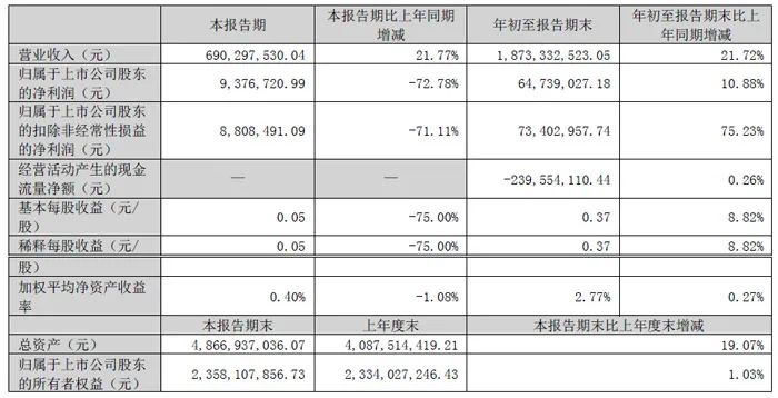 第三季度實現營收6.90億元,同比增長21.77%,環比增長7.76%;歸母凈利潤937.67萬元,同比下降72.78%,環比下降61.91%;扣非凈利潤880.85萬元,同比下降71.11%,環比下降99.49%。